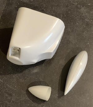 new cowling and wheel pant masters on the left versus the kit supplied ones on the right