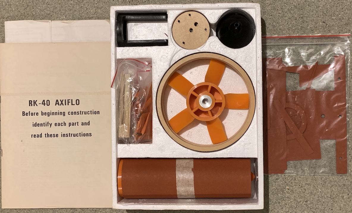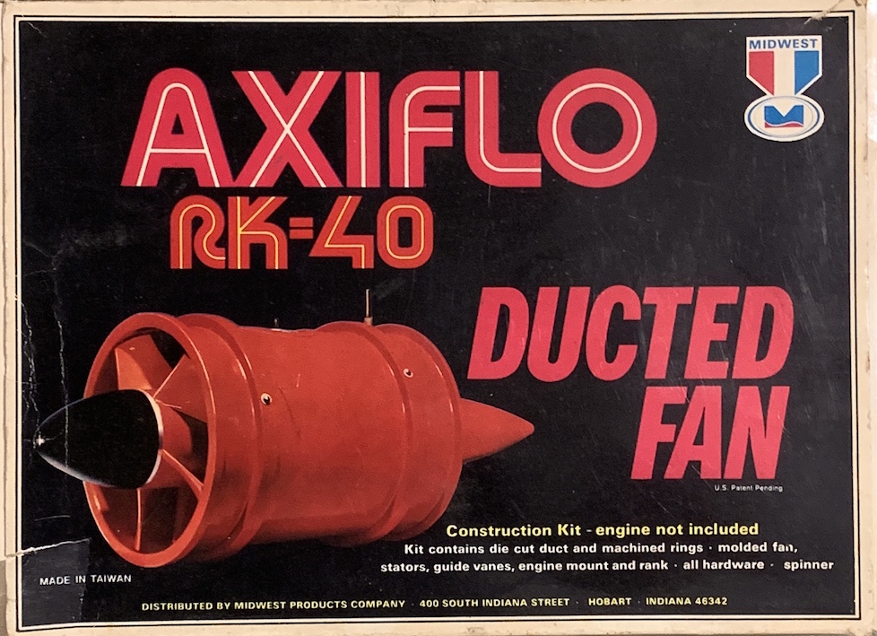 | I bought a similar Axiflo RK-40 (my first Ducted Fan unit) in the Christiaensen model shop in Knokke as soon as it became available in Belgium (1977). Actually, I was on my way to buy another newly released Svenson kit, the Twinny (the little sister of the Wayfarer), but when I saw the Axiflo, I changed my mind and this was the start of my involvement in scale jet models... I still have two NIB examples of the Axiflo RK-40 in my collection |