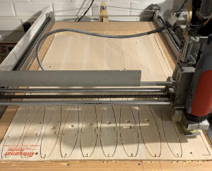 drawings almost done (only plan #1 is shown: fuselage and stab) first balsa parts being CNC routed (wing ribs) all wood parts are now CNC cut, so construction work will be following shortly