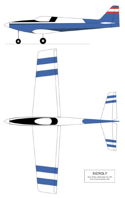 Some background The Sicroly is an RC1 pattern model airplane designed around 1970 by Hans and Hanno Prettner. This was way before Hanno started accumulating his Word Champion title successes, so it is not as well known as his later models. The Sicroly is the predecessor of the Super Sicroly with which Hanno participated at the 1971 and 1973 World Championships. His first win was with the well known Curare in 1977. Later he would win more titles: 1981 with Magic, 1983 with Calypso, 1985 with Supra Fly, both 1987 and 1989 with Supra Star and finally in 1993 with Mystic 60. Hanno Prettner has inspired generations of RC builders and pilots and still does today. His more popular designs are shown below. Super Sicroly (1971-1973), Curare (1975-1977), Magic (1981) and Calypso (1983) Supra Fly (1985), Supra Star with Ayrton Senna (1987-1989) and Mystic 60 (1993) The Sicroly is indeed much less known. I first came accross a photo of the Sicroly in an advert for a kit of Radu Balea's remake model which has a slightly altered shape (in the first place to facilitate fitting retracts). The box lid showed a picture of Hanno's original and that stirred my curiosity. A search on the internet didn't reveal a lot, so I contacted both Radu and Hanno to know if any more photographs or drawings did exist. Both gentlemen kindly sent me some information on the background of the model, but unfortunately, no drawings had been preserved. I did learn however that the Sicroly was the follow up design of the Acroly and Wicroly from the second half of the sixties. Hans and Hanno with the original Acroly Hanno with the Wicroly and some early trophies (circa 1967)