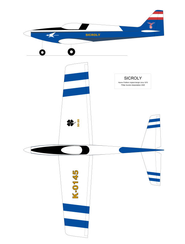 2. Sicroly project Below are the only two photographs I have found of the Sicroly. The elegancy of this model struck me from the first time I saw it. I liked the looks so much that I decided to add the Sicroly to my list of projects (the Topp Comet II is awaiting further building). I could of course have bought the beautiful high quality kit manufactured by Radu Balea, but in my opinion, his interpretation compromises somewhat in elegancy and doesn't fully capture that elegant look. That's why I decided to make my own version (which in all honesty won't be 100% authentic either). Hanno preparing the Sicroly for flight (still in initial finish) Hanno posing with the Sicroly (now with some added graphics on wing and fuselage) Sicroly kit manufactured by Radu Balea Sicroly model as built from the Radu Balea kit So I decided to redesign the model to make a one off model of what I think is a more authentic replica of the over fifty years old design by Hans and Hanno Prettner. Below is my attempt at this in the form of a 2 view drawing. At time of writing (February 2026), the construction drawings have well progressed. The drawings are now converted in usable files for CNC cutting which has begun. As soon as there is more progress in the project, this page will be updated. 2 view drawing with my interpration of the Sicroly