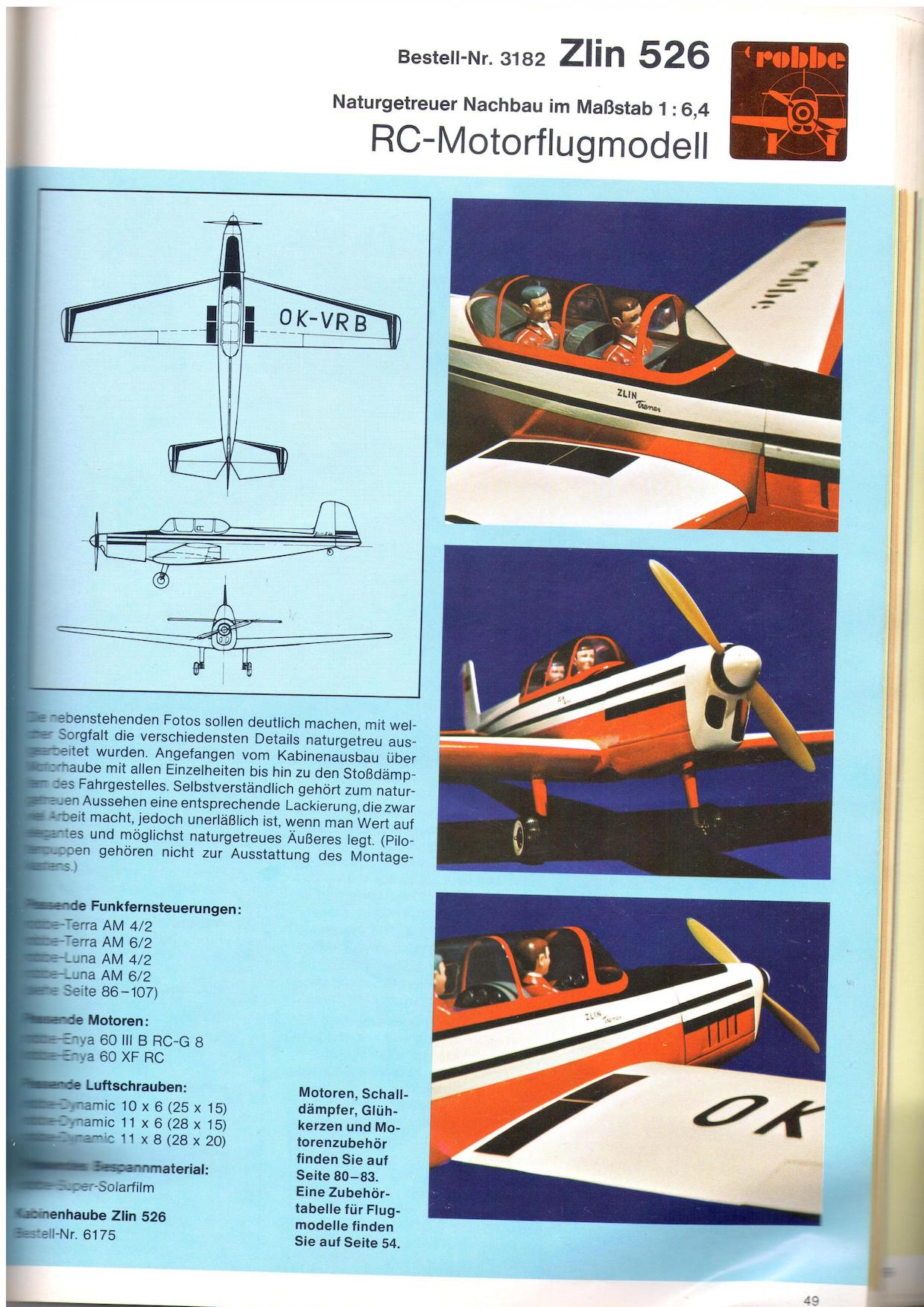 I built a similar model almost 50 years ago (!). At that time, my experience at building and flying RC models was very limited. I remember that my uncle Jean (pronounced as "John") donated the kit to me in anticipation of my 18th birthday. My uncle Jean was the elder brother of my uncle Jack and happened to be my godfather. He was also an avid RC enthousiast but was definitely less productive than his brother.artist impression on the box cover of the Robbe Zlin 526 kit I managed to build that kit with the little tools I had at that time and I was quite pleased with the result. The paint scheme I chose for that first model was a bit more colorful than the original, as I got inspired by a wonderful model of the Sig Zlin Z 526 AS Akrobat hanging in he Christiaensen toy and model shop in Knokke in the mid seventies. a poor quality picture of my first Zlin 526 model, almost 50 years ago I had purchased an Enya 45 II engine in a Folkestone model shop on a day trip to England with the ferry from Ostend, to power the model. It was one of the recommended engines by Robbe. It took me some time to improve my flying skills before I finally made the first flight some time later (I think it was in the summer of 1979). It was my first low wing model and I remember it was quite a challenge in my relatively inexperienced hands. It certainly didn’t help that the wings were not built straight… So the model was short-lived. I can’t remember after how many flights the model was crashed beyond repair, but I think it was less than ten. I was determined to build a new one, once I had gained sufficient experience but I didn’t expect it would take almost 50 years before this became reality… The Robbe Zlin 526 appeared in the Robbe catalog in 1976 as one of its top models, but it didn't gain much popularity. It was sold for a short while only, hence it was difficult to find an untouched kit after such a long time.scans from the 1976 Robbe catalog clrearly showing the semi scale nature of the model (fixed gear, modified airfoil, simple sheet surface tail surfaces, simple cockpit details etc.) I was searching for many years until recently, one popped up on a German second hand site but it was missing the instructions. Furthermore, it was not in a really good shape. I bought it anyway and a few weeks later, another one popped up on a Belgian second hand site. I bought that one as well as it was complete with instructions and in a far better shape. kit contents were still quite good after almost half a century My list of models to be built was quite long, but I bypassed the list and started the build right away. During the build, I couldn’t believe I had been able to accomplish the task as a youngster with little tools and little experience. It is quite a challenging build and that’s probably the reason why almost nothing can be found in terms of finished models from this kit. In all honesty, Robbe kits were not as well engineered as those from Graupner, that other famous German kit manufacturer. kit. Anyway, with the help of all the tools in my workshop and my accumulated building experience, building the model today was quite a bit easier. At this stage, the airframe is 95 percent built and finished. Preparation for flight is still to be done.first stages of the build For power, I chose the rather unconventional RCV 58CD four stroke engine. I was very pleased with that engine in the Sig Citabria, my previous build, so I purchased another one on a Dutch second hand site. It was advertised as “brand new” but as it turned out, the engine was not complete, the mounting lugs had been drilled out, had been mounted and had probably run. I was not pleased but decided to keep the engine as it fits the Zlin beautifully and the fuselage was already under construction including the new integrated motor mounts specifically made to accommodate the RCV 58CD. I made a few changes to reflect the use of modern RC equipment. Fifty years ago, servos were very expensive, so only one was used to drive both ailerons through 90 degree bell cranks. It was only logical to install two aileron servos now, avoiding the slop associated with the original configuration. By the way, this is a modification I do on all retro builds. I wanted to keep the retro feel and build the model as it was designed, so with the modified airfoil (NACA 0017), the flat stab and fin and the fixed landing gear. I did however incorporate two degrees of washout as the wing tapers considerably and is prone to tip stalling as experienced with my first Zlin 526. wing halves in different stages of the build