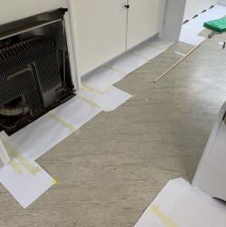 finished cabinet door with hardware installed After that was done, the installation of the doors was completed. cabinet doors installed The kitchen control panels were refurbished and painted black. I duplicated all markings by taking photographs and redrawing them on the computer. The graphics were then used to print them with my laser printer with white toner (replacing the black toner) on a clear decal sheet. I use this technique to create white decals for my (plastic) model airplanes. With the white decals placed, the control panels and the kitchen sink could be put back in place. It was quite a challenge to make the sink cover panels and to replicate their correct articulation, but I'm more than happy with the result.sink covers in action The task I dreaded the most was replacing the floor covering. Thanks to the encouragement of some friends, I eventually decided to tackle the job and I can proudly say it was absolutely worth the effort. A contemporary look vinyl floor covering was chosen (Holly Beige Oak from Kwantum). A template was made out of scrap A4 paper sheets individually cut to cater for the most difficult recesses and all taped together to form a large single piece template.step by step process of making the template I was a bit worried about the accuracy of the template due to the high dampness: it was raining outside at the moment of making. After the rain had stopped, I took the template inside the house and taped it on top of the vinyl blank. I then proceeded to cut it out keeping an approximate 2 mm gap all around.template positioned over the vinyl blank