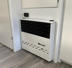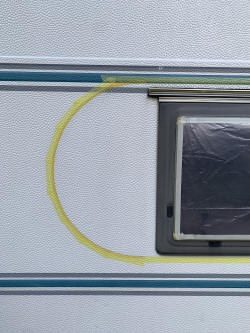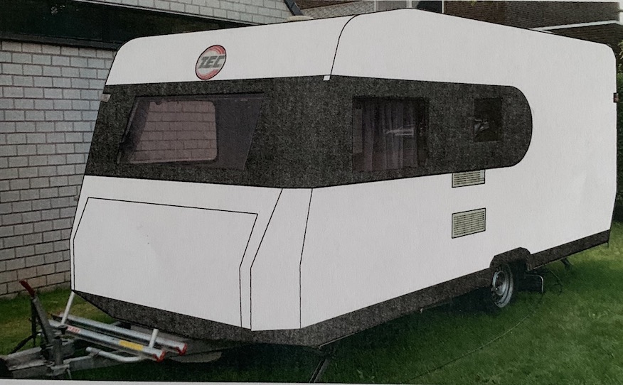 vinyl blank precision cut to size The erratically shaped vinyl floor piece was then carried into the caravan, hoping it would fit... And it did perfectly without any adjustments at all. Needless to say I was very pleased! The floor is free floating on top of the old floor and that seems to be totally ok.floor installed with the old cushions still visible on the left The ugly brown cover of the Trumatic 3200 gas heater was painted a modern white and black and the logo refurbished.old and new look of the Trumatic heater and floor covering During the make over, I fixed some minor defects and installed a few extra 220V wall outlets. All light bulbs were replaced with their LED equivalents. The toilet space was left as it was except for the brown areas painted white.toilet space was still ok, so mostly left untouched A new table for the train seat arrangement was made from the same material as the cabinet doors. The mounting rai ls were painted in black to cover the earlier gold anodized look. There are two of these at different heights, the lower one being used when the arrangement is being transformed into a sleeping bed.All new neutral gray (Southend Anthracite) cushions for the train seat arrangement were beautifully manufactured by a Dutch online shop with a peculiar name: Nofruit. All beds received new gray bed linen from Action, giving a balanced neutral look. new cushions, new table and rails painted black gray bedlinen installed and final test of the RGB LED indirect lighting (also visible top left: refurbished roof window) gray bedlinen installed and final test of the RGB LED indirect lighting The final interior job was to be the installation of a piece of art from my dear uncle Gustaaf Avonds (deceased in 2021 at the age of 95). This stunning abstract piece of art brings some colour in the otherwise quite sterile white interior. In my eyes, the perfect balance. The original work is smaller and too delicate, so it was photographed and transferred onto a 64 by 36 cm canvas, courtesy MyPoster in Germany.colourful artwork installed With the interior now completed, I was very much tempted to do the outside as well, so I made a few designs on my computer. Below some photographs of before and artist impressions after of the black and white scheme that was withheld. before and after... before and after... In the spring of 2024, I decided to do the job. Multiple weather forecast apps agreed that a few good days were coming up, so the caravan was fetched from storage. A good washing and degreasing was up first. This was done with Solarine. A good dry rubbing with Scothbrite followed. Then came the task of masking of all windows and smaller items like lighting etc. windows and lighting all masked (tail lights were removed) Normally, one would do the white first and the black on top, but I reversed the procedure because of the horizontal lines on the old scheme which ultimately were very helpful for aligning the black demarcation. To do the half circle, I cut some masking strips with the correct radius on my Roland Stika (also used to cut the new markings, see further on). demarcation line between black and white I also masked all rails above the windows and the large awning rail on the right hand side to make sure paint would not enter the rails. Now all appropriate areas were painted black. I used a simple paint brush and a roller for that. Spraying was out of the question on this outside job. The paint used was the same as for the interior: V33 kitchen renovation paint. Two coats (and in some areas three) were necessary. black paint applied I observed a lot of paint creeping through the "valleys" of the rough surface texture under the masking tape. This was not a problem at this time, but I wanted to avoid that as much as possible when applying the white over the black. So I proceeded with masking all the demarcation lines again, this time from the opposite side. When that job was finished, I first brushed some black paint along all demarcation lines, in the hope the black would creep under the masking tape and prevent any white to do the same later. I can already disclose that it worked very well indeed. white applied on all sides except roof portion The roof was tackled a day later. In fact, I did only the part of the roof which is visible horizontally. With that finished, it was time to remove the masking tape and have a first impression of the final result. Note that in the mean time I had installed a third brake light to improve safety. masking tape removed