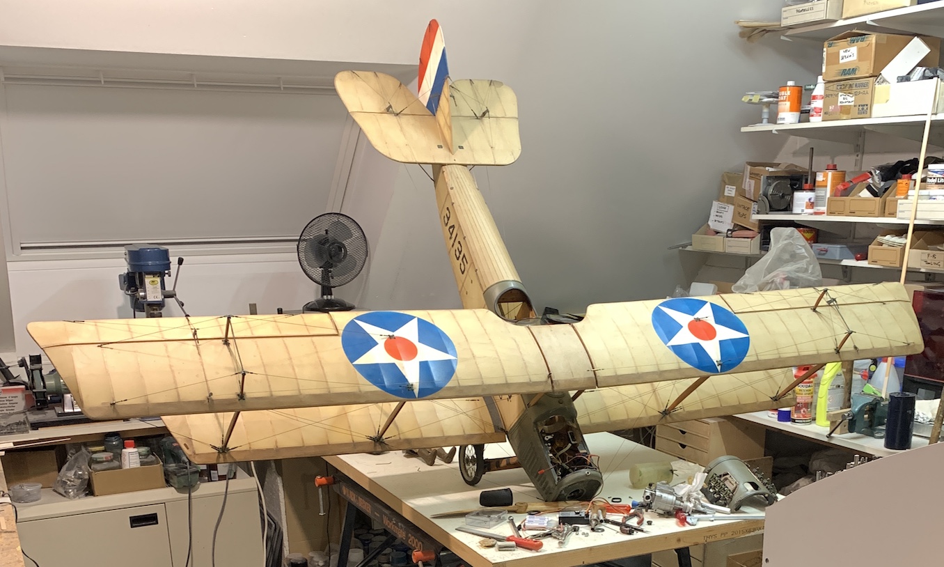 old photo of the Curtiss Jenny with static prop At first, it was not my intention to fly the model as it had some issues (like a few broken brass fittings), but towards the end of 2025, I started changing my mind so I investigated the feasibility to make her fly again. the assembled Jenny took quite some space in my workshop during the restoration work The previous owner had substituted a slightly larger engine, a brand new OS MAX FSA 81. I don’t know which engine was installed previously, but it could well have been an OS MAX FS70 Surpass as it is about the only engine with the same mounting dimensions. The FSA 81 needed some disassembly and cleaning as it had gummed up during storage. I received only a scale static balsa propeller with the model, so I installed a suitable flying propeller.new OS FSA 81 installed with a scale looking 15-6 wooden flying propeller I replaced the old fuel tank, installed new fuel tubing and checked all the controls and servos. Incidently, fuelling is done through the cap on top of the radiator. Another unique feature is the fact that the sticks and pedals in both cockpits follow the movement of the associated control surfaces. These control surfaces are actuated by cables, exactly like the full size. The power switch is activated with the throttle lever (from either cockpit). A new 2.4 GHz receiver with gyro stabilization was installed, together with a new airborne battery. The landing gear and tail skid have some kind of suspension in the form of rubber bands. These of course needed replacement which I found in a Veritas shop.new rubber bands for main gear suspension I’m waiting for a calm day to put the Jenny into the air again, 43 years after she was built, but I will first do some engine runs at home to make sure everything is fine before flying. I will update this page as soon as I have further news. (*) Proctor Enterprises are still in business at time of writing (Jan 2026) and the kit can still be purchased, see their website.