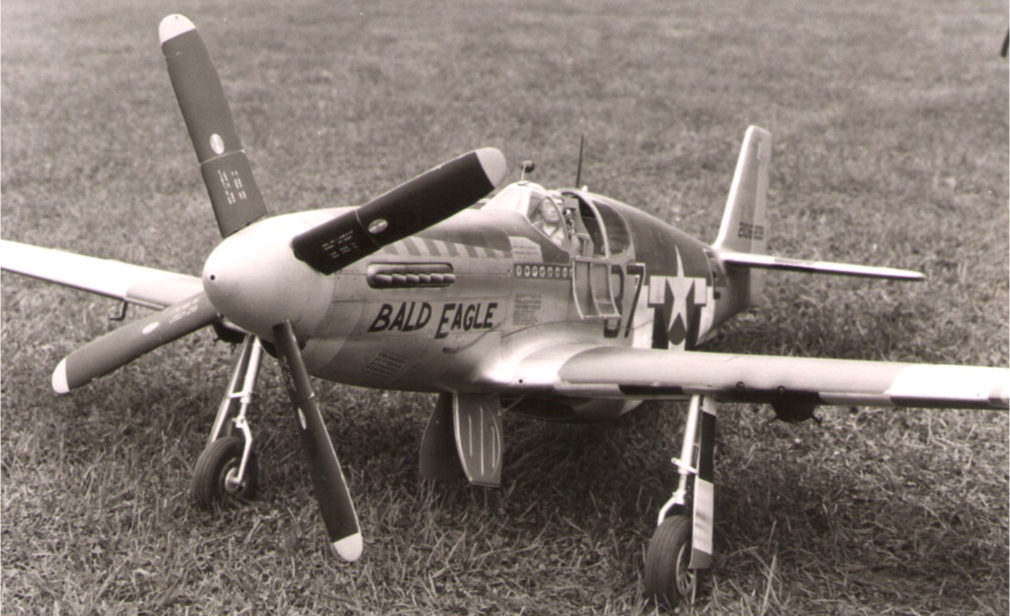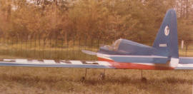 P-51B Mustang from David Vaughan plan. Originally powered by an OS MAX 60 FSR two stroke engine. It won 8th place at the F4C World Championships in Le Bourget, France (1984). Sadly, it crashed beyond repair after an engine upgrade to a four stroke OS MAX FS-90 following aileron flutter. It was an excellent and realistic flyer... |