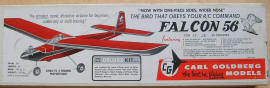 | I built my Falcon 56 from the classic Goldberg kit with reduced dihedral and barn door ailerons. I covered the wings and stab with a translucent blue film next to the white paint finish. Engine is the thrusty FOX 25 RC which was used in several other models. I also built a Junior Falcon and a Falcon 56 Mark II but sadly have no pictures of those models (but I do have an unbuilt example of the latter kit in my collection) |