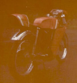 The bike was later completely restyled as seen below. The long fuel tank was in fact a fibreglass dummy that covered the original fuel tank. I upholstered the fibreglass seat myself. That way, I got introduced at working with a sewing machine. The full fairing was a complete new design, made to fit my posture. The bike was a pleasure to ride. |