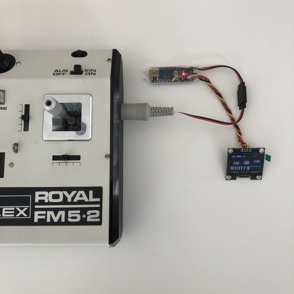 The battery indicator is adapted to show the LiPo voltage in expanded scale. futhermore, the exact voltage can be read through the DIN socket. Finally, PPM can be read out through the same DIN socket, which can be helpful to memorize trim settings on multiple aircraft. |