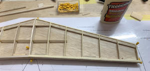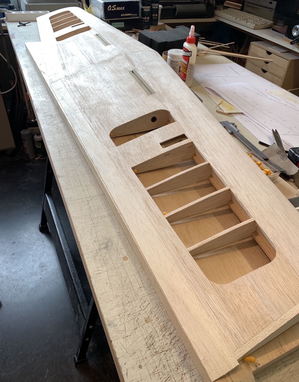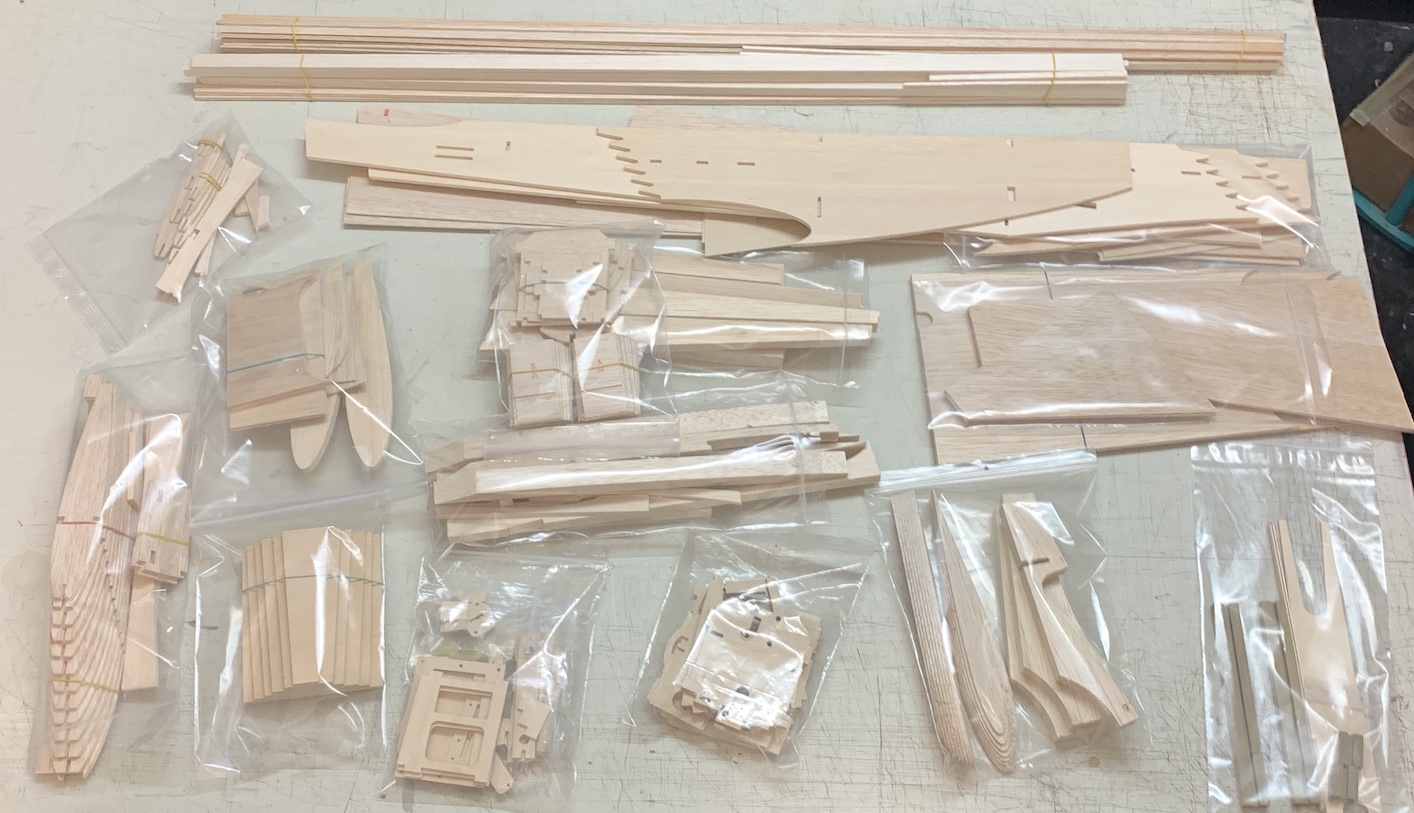 drawings almost done (only plan #1 is shown: fuselage and stab) first balsa parts being CNC routed (wing ribs) all wood parts are CNC cut, ready for construction work Construction work has started and is progressing rapidly, thanks to the highly prefabricated parts shown on the photo above.What a pleasure to build! Wing is constructed first, followed by stab and fin, and finally, the fuselage, see photo sequence below. wing construction