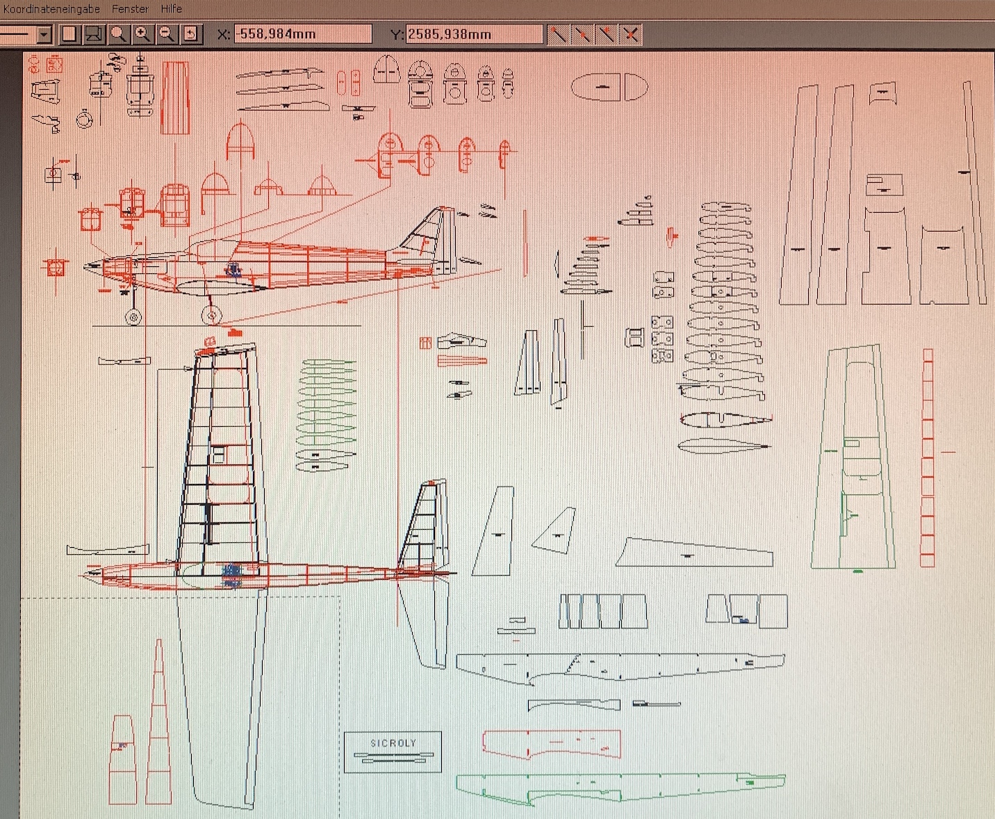 2. Sicroly project Below are the only two photographs I have found of the Sicroly. The elegancy of this model struck me from the first time I saw it. I liked the looks so much that I decided to add the Sicroly to my list of projects (the Topp Comet II is awaiting further building). I could of course have bought the beautiful high quality kit manufactured by Radu Balea, but in my opinion, his interpretation compromises somewhat in elegancy and doesn't fully capture that elegant look. That's why I decided to make my own version (which in all honesty won't be 100% authentic either). Hanno preparing the Sicroly for flight (still in initial finish) Hanno posing with the Sicroly (now with some added graphics on wing and fuselage) Sicroly kit manufactured by Radu Balea Sicroly model as built from the Radu Balea kit So I decided to redesign the model to make a one off model of what I think is a more authentic replica of the over fifty years old design by Hans and Hanno Prettner. Below is my attempt at this in the form of a 2 view drawing. At time of writing (February 2026), the construction drawings have well progressed. The drawings are now converted in usable files for CNC cutting which has begun. As soon as there is more progress in the project, this page will be updated. 2 view drawing with my interpration of the Sicroly