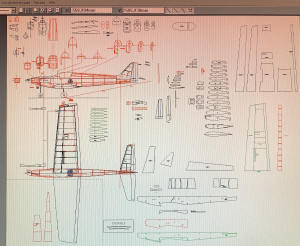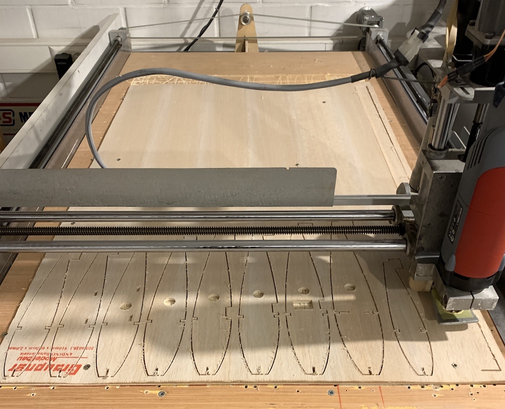 construction drawings in progress (looks very chaotic and needs a lot of clean up work) first balsa parts being CNC routed (wing ribs)