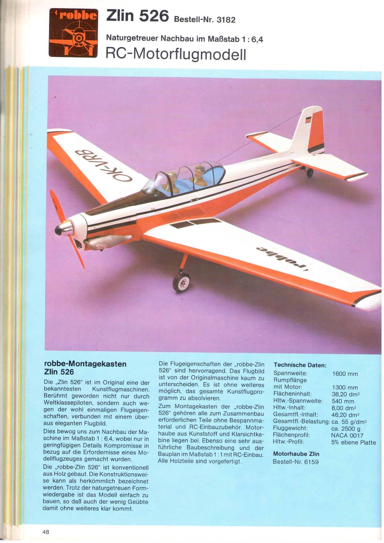 I built a similar model almost 50 years ago (!). At that time, my experience at building and flying RC models was very limited. I remember that my uncle Jean donated the kit to me in anticipation of my 18th birthday. Uncle Jean was the elder brother of uncle Jack and happened to be my godfather. He was also an avid RC enthousiast but was less productive than his brother. artist impression on the box cover of the Robbe Zlin 526 kit I managed to build that kit with the little tools I had at that time and I was quite pleased with the result. The paint scheme I chose for that first model was a bit more colorful than the original, as I got inspired by a wonderful model of the Sig Zlin Z 526 AS Akrobat hanging in he Christiaensen toy and model shop in Knokke in the mid seventies. a poor quality picture of my first Zlin 526 model, almost 50 years ago I had purchased an Enya 45 II engine in a Folkestone model shop on a day trip to England with the ferry from Ostend, to power the model. It was one of the recommended engines by Robbe. It took me some time to improve my flying skills before I finally made the first flight some time later (I think it was in the summer of 1979). It was my first low wing model and I remember it was quite a challenge in my relatively inexperienced hands. It certainly didn’t help that the wings were not built straight… So the model was short-lived. I can’t remember after how many flights the model was crashed beyond repair, but I think it was less than ten. I was determined to build a new one, once I had gained sufficient experience but I didn’t expect it would take almost 50 years before this became reality… The Robbe Zlin 526 appeared in the Robbe catalog in 1976 as one of its top models, but it didn't gain much popularity. It was sold for a short while only, hence it was difficult to find an untouched kit after such a long time.scans from the 1976 Robbe catalog clrearly showing the semi scale nature of the model (fixed gear, modified airfoil, simple sheet surface tail surfaces, simple cockpit details etc.) I was searching for many years until recently, one popped up on a German second hand site but it was missing the instructions. Furthermore, it was not in a really good shape. I bought it anyway and a few weeks later, another one popped up on a Belgian second hand site. I bought that one as well as it was complete with instructions and in a far better shape. kit contents were still quite good after almost half a century My list of models to be built was quite long, but I bypassed the list and started the build right away. During the build, I couldn’t believe I had been able to accomplish the task as a youngster with little tools and little experience. It is quite a challenging build and that’s probably the reason why almost nothing can be found in terms of finished models from this kit. In all honesty, Robbe kits were not as well engineered as those from Graupner, that other famous German kit manufacturer. kit. Anyway, with the help of all the tools in my workshop and my accumulated building experience, building the model today was quite a bit easier. At this stage, the airframe is 95 percent built and finished. Preparation for flight is still to be done.first stages of the build For power, I chose the rather unconventional RCV 58CD four stroke engine. I was very pleased with that engine in the Sig Citabria, my previous build, so I purchased another one on a Dutch second hand site. It was advertised as “brand new” but as it turned out, the engine was not complete, the mounting lugs had been drilled out, had been mounted and had probably run. I was not pleased but decided to keep the engine as it fits the Zlin beautifully and the fuselage was already under construction including the new integrated motor mounts specifically made to accommodate the RCV 58CD. I made a few changes to reflect the use of modern RC equipment. Fifty years ago, servos were very expensive, so only one was used to drive both ailerons through 90 degree bell cranks. It was only logical to install two aileron servos now, avoiding the slop associated with the original configuration. By the way, this is a modification I do on all retro builds. I wanted to keep the retro feel and build the model as it was designed, so with the modified airfoil (NACA 0017), the flat stab and fin and the fixed landing gear. I did however incorporate two degrees of washout as the wing tapers considerably and is prone to tip stalling as experienced with my first Zlin 526. wing halves in different stages of the build